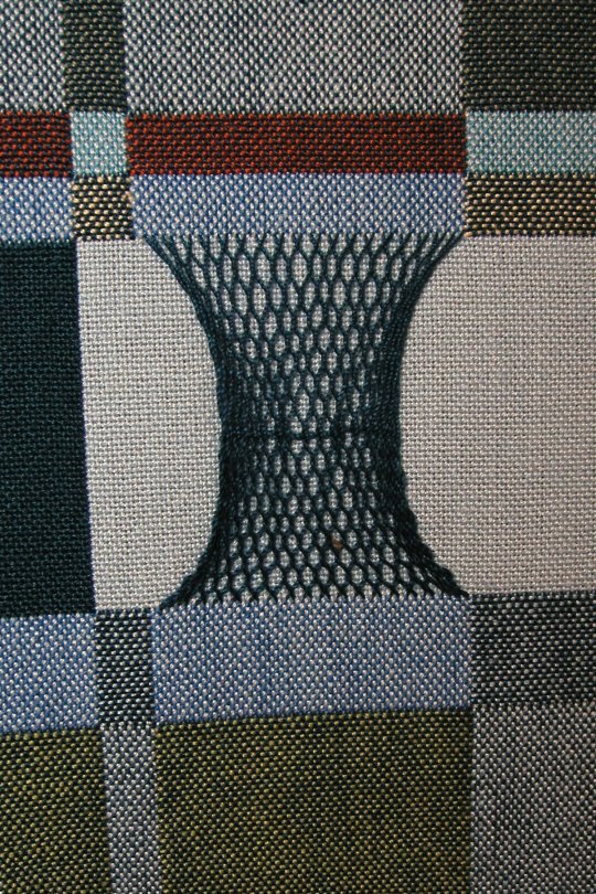So, simple enough to just tie up a couple more treadles to always lift my sprang warps, and weave plain weave with the ones that won't be used. This bit of fabric is weft-dominant and kind of loosey-goosey, but I think it will do the trick to allow the flap to be pressed back and tacked to the fabric like a little facing.