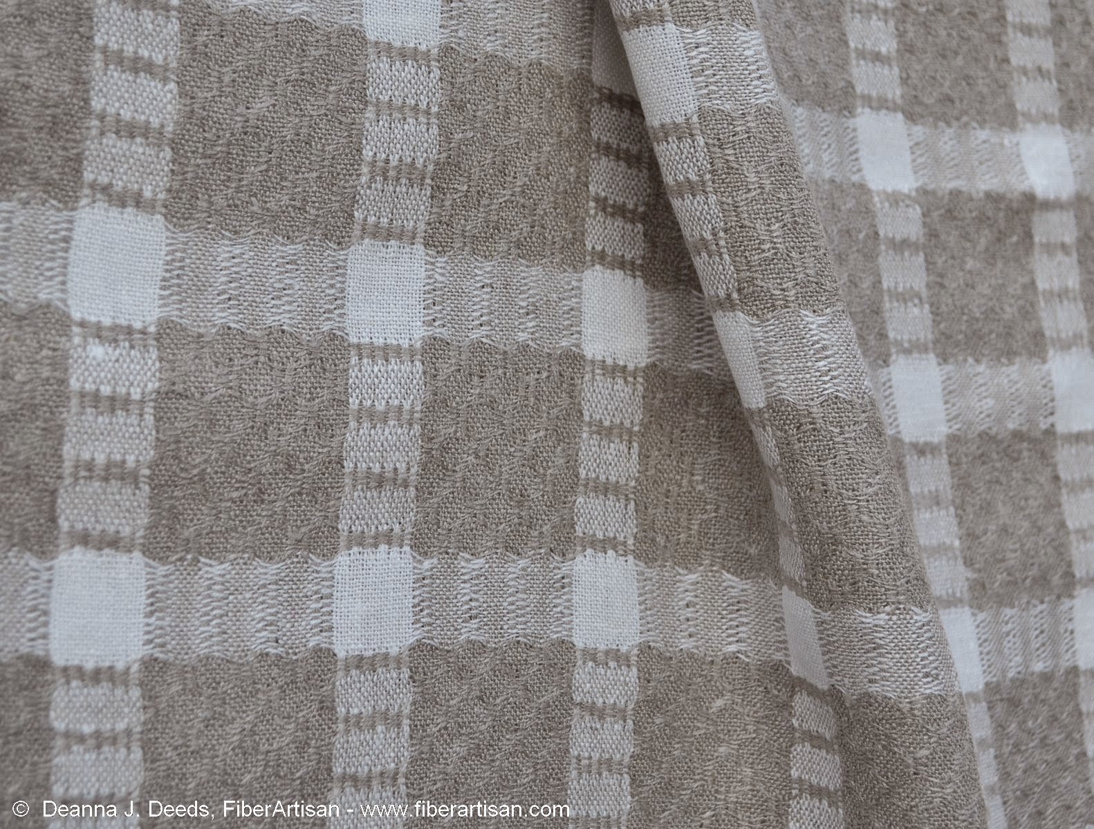 Ms & Os weave, 40/2 linen (bleached & unbleached), 30 epi/ppi. The photo is of the towel after hemming and wet-finishing and ironing. I really like this one; I may have to explore this structure further.